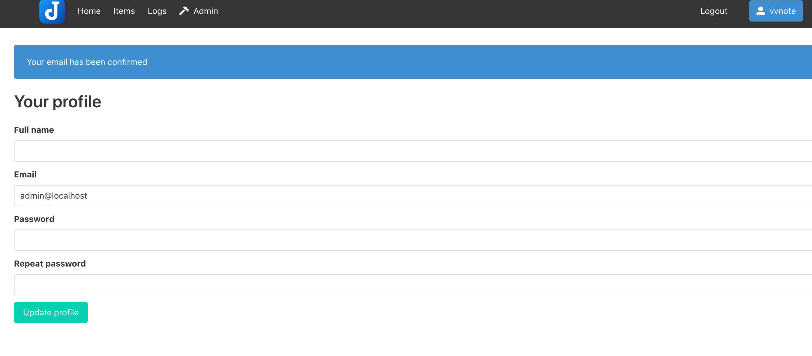 登录后先更新密码,这里如果上面不配置邮件服务相关的环境变量的话是没办法修改邮箱的,因为修改邮箱会发送一封确认邮件,点击确认后才能修改成功。