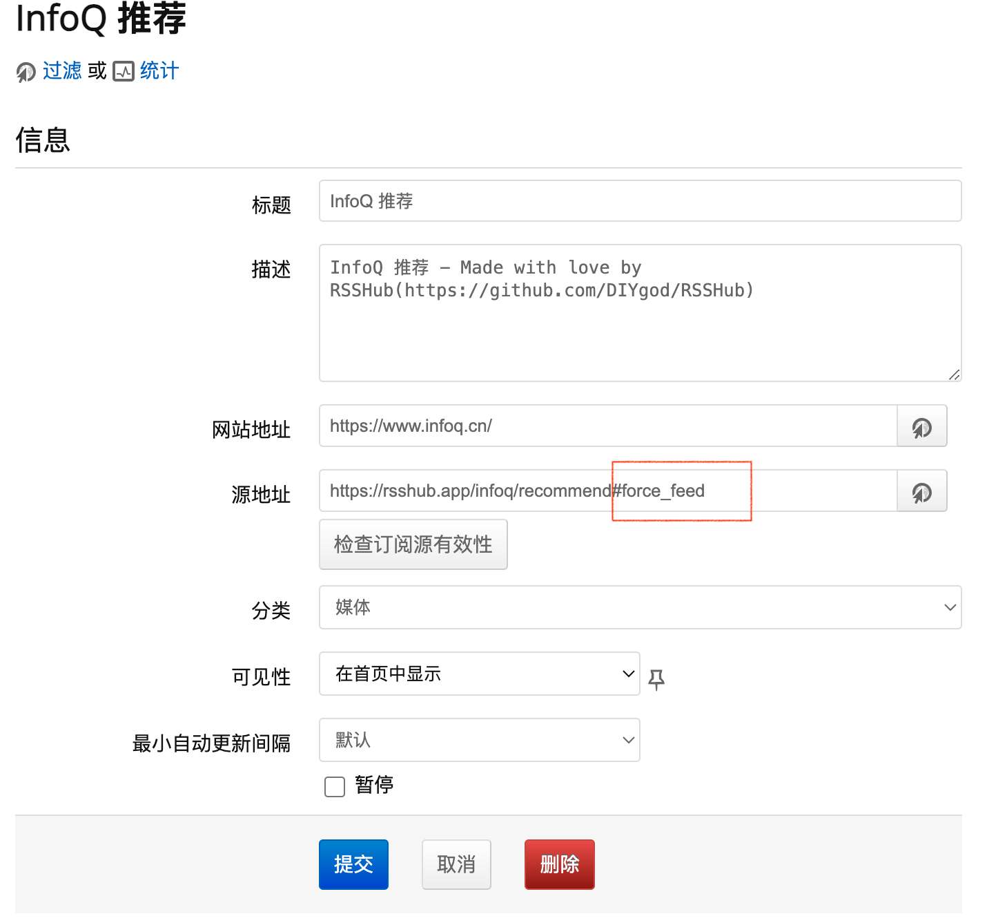 正常情况下订阅地址可以正常访问手动添加订阅时能正常添加,一些需要走代理的订阅需要添加#force_feed参数强制添加,然后再在下面代理配置里设置代理