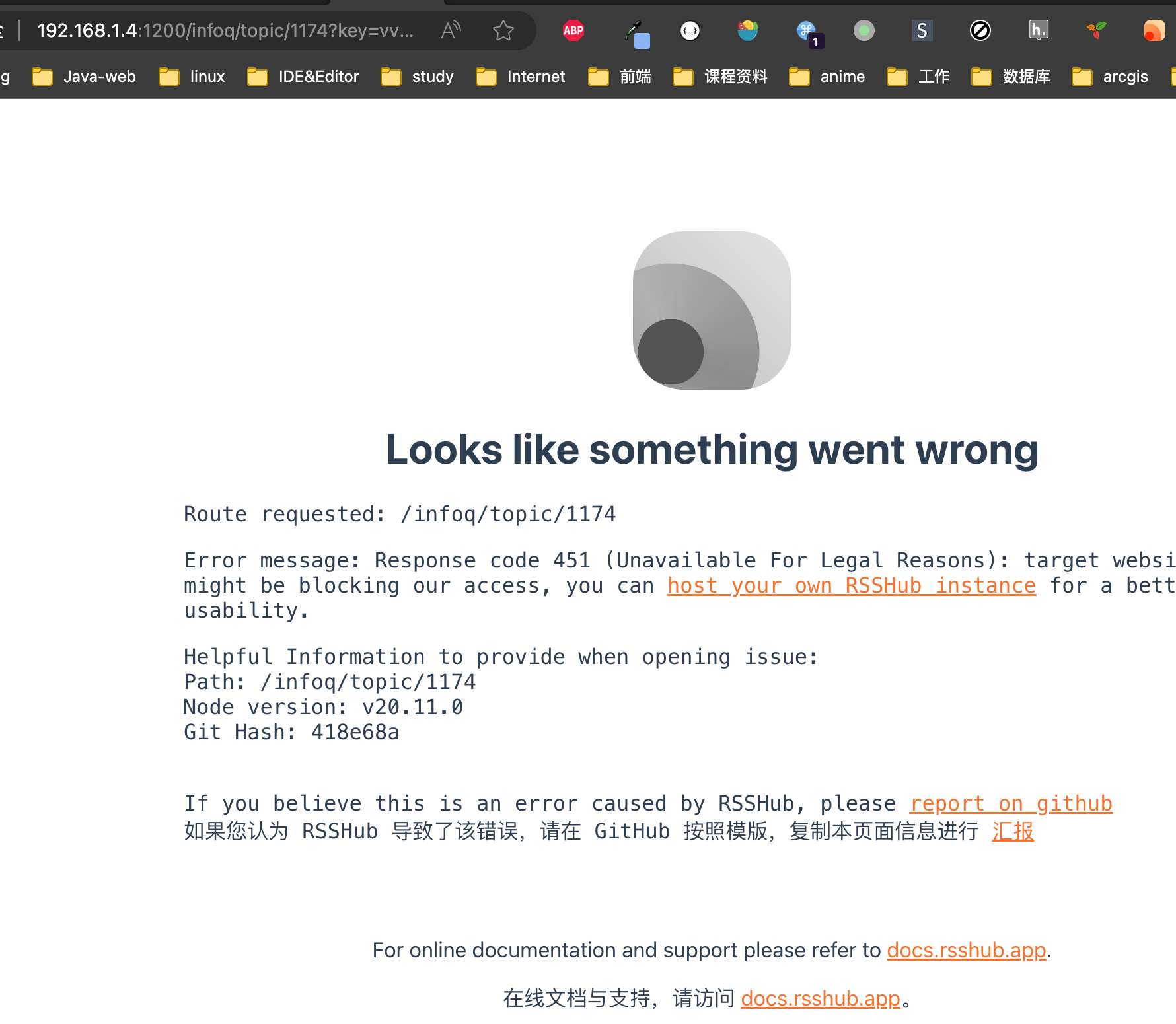 按RssHub文档中的api访问有些时候会出现数据获取不到的情况,看报错像是被禁止访问了,可能是目标网站有反爬机制,我就直接使用的官方服务了,不过官方域名国内访问需要使用代理,在FreshRss里配置的时候需要配置上代理。