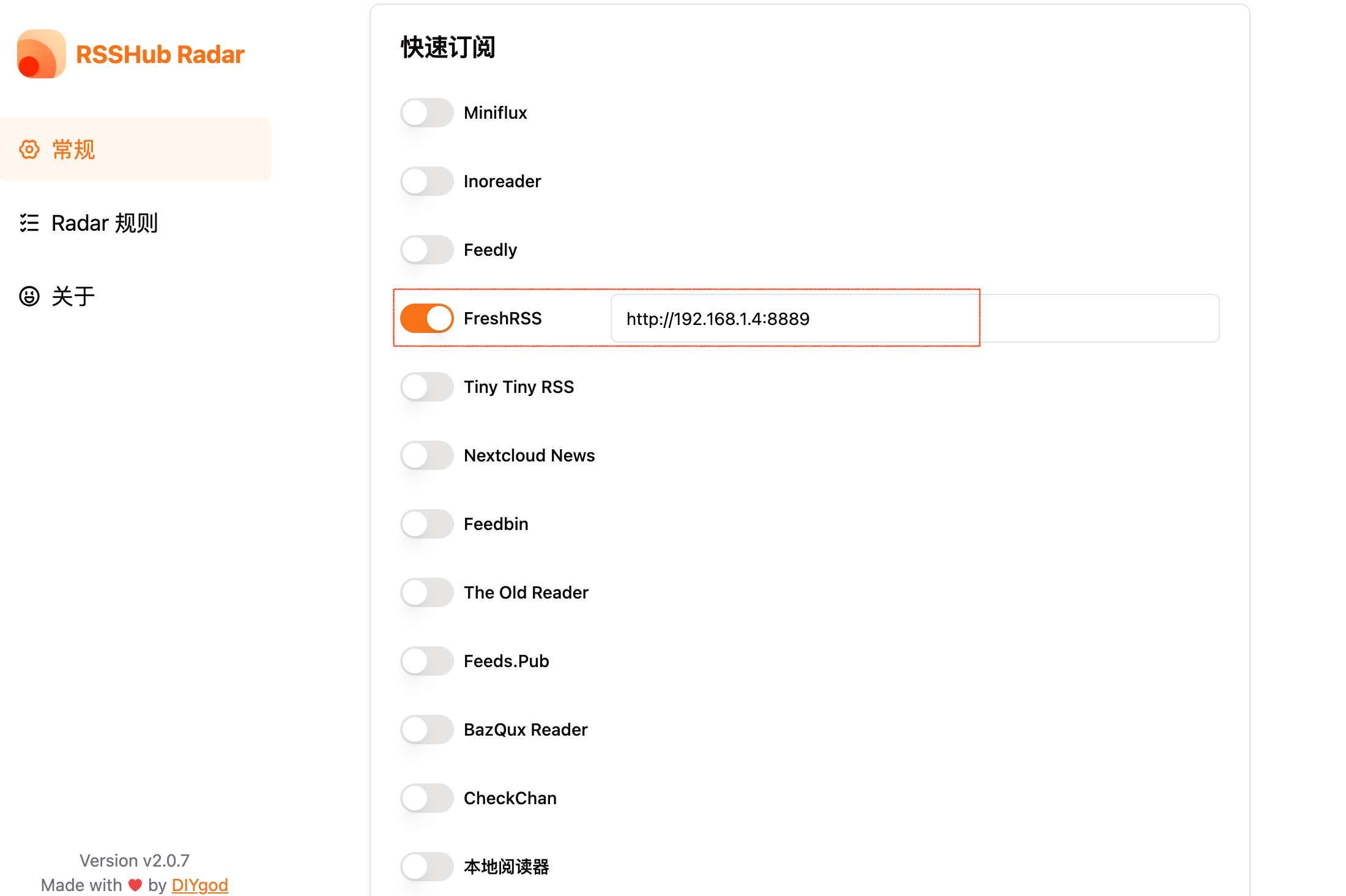 插件支持在多种rss订阅服务里添加订阅,这里用的是FreshRss免费开源,支持docker部署。