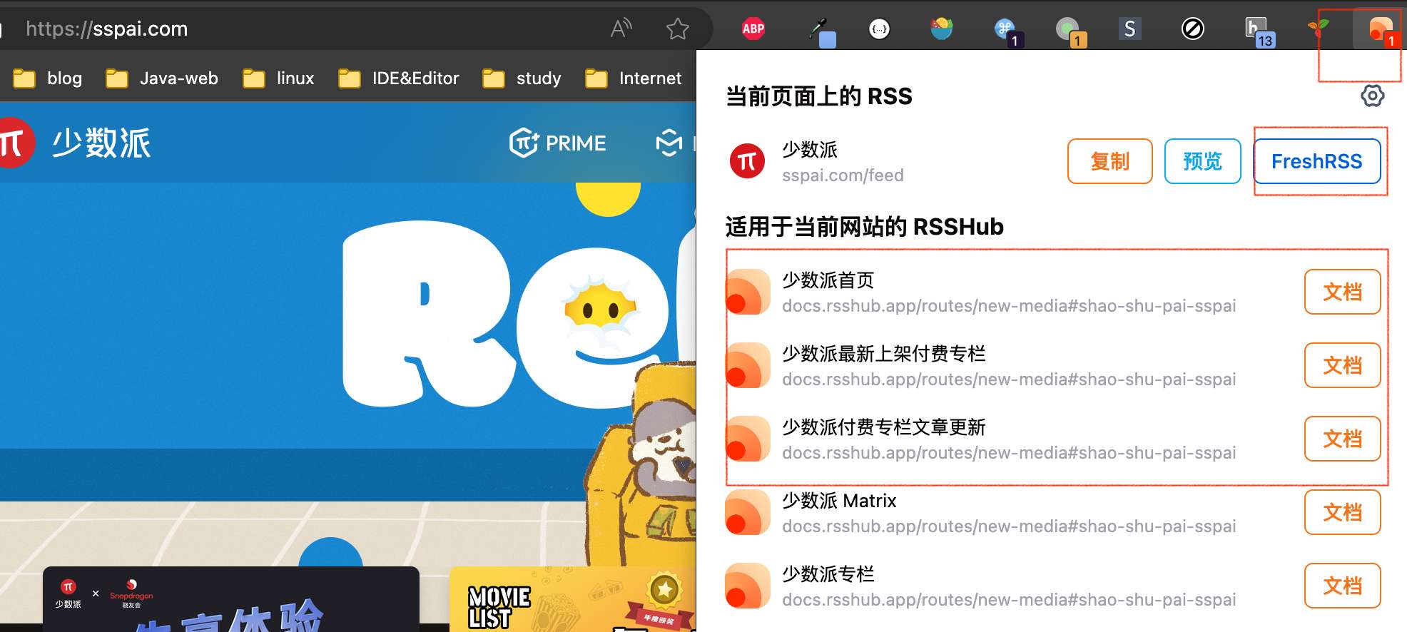 使用也十分方便,如过网站支持rss,插件自动就有提示,点击FreshRSS就会将当前网站的rss订阅添加到FreshRSS中。下面的RSSHub针对当前网站支持的api,用法就是可以将订阅地址直接写成 rsshub服务地址+路径 的形式,如过设置了密钥后面要加上密钥参数。